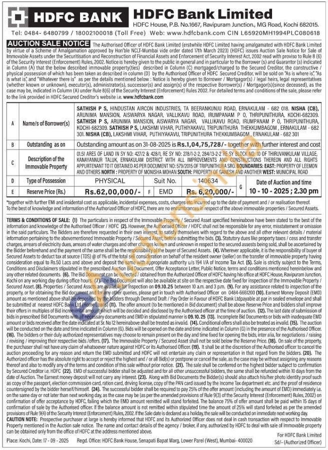 01.51 ARES OF LAND IN SY NO: 427/2 & 428/1, RE SY NO: 278/1-2-2, 284/13-2-2 RE SY BLOCK NO: 10 OF THIRUVANKULAM VILLAGE KANAYANNUR TALUK, ERNAKULAM DISTRICT WITH ALL IMPROVEMENTS AND CONSTRUCTIONS THEREON AND ALL RIGHTS APPURTENANT TO IT OBTAINED AS PER DOCUMENT NO: 579/2015 OF TRIPUNITHURA SRO. BOUNDARIES: EAST: PROPERTY OF LEEMON AND OTHERS NORTH: PROPERTY OF MONISHA MOHAN SOUTH: PROPERTY OF GANESH AND ANOTHER WEST: MUNICIPAL ROAD