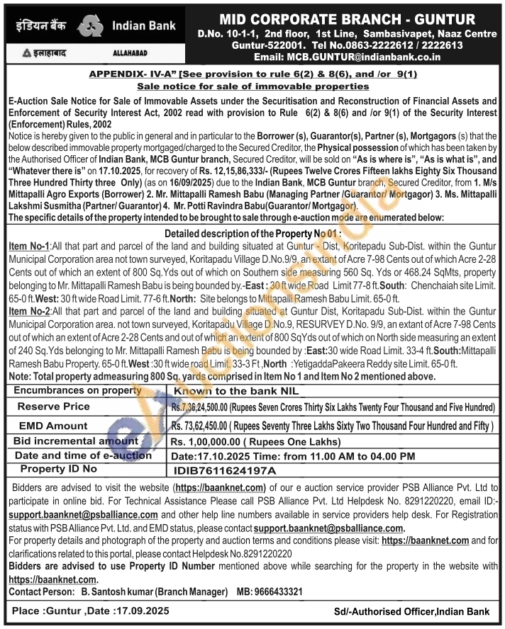 Item No-1:All that part and parcel of the land and building situated at Guntur - Dist, Koritepadu Sub-Dist. within the Guntur Municipal Corporation area not town surveyed, Koritapadu Village D.No.9/9, an extant of Acre 7-98 Cents out of which Acre 2-28 Cents out of which an extent of 800 Sq. Yds out of which on Southern side measuring 560 Sq. Yds or 468.24 SqMts, property belonging to Mr. Mittapalli Ramesh Babu is being bounded by.-East: 30 ft wide Road Limit 77-8 ft. South: Chenchaiah site Limit. 65-0 ft. West: 30 ft wide Road Limit. 77-6 ft. North: Site belongs to Mittapalli Ramesh Babu Limit. 65-0 ft.