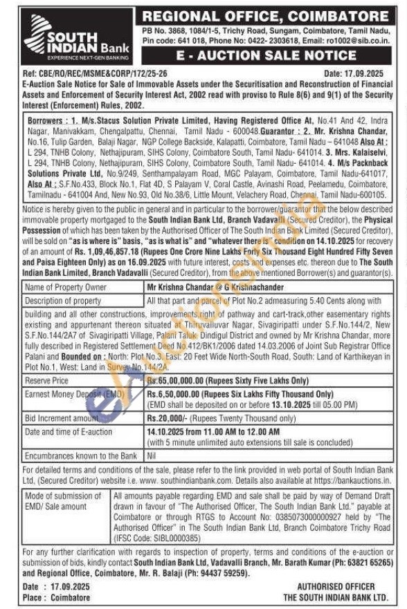 All that part and parcel of Plot No.2 admeasuring 5.40 Cents along with building and all other constructions, improvements, right of pathway and cart-track, other easementary rights existing and appurtenant thereon situated at Thiruvalluvar Nagar, Sivagiripatti under S.F.No.144/2, New S.F.No.144/2A7 of Sivagiripatti Village, Palani Taluk, Dindigul District and owned by Mr Krishna Chandar, more fully described in Registered Settlement Deed No.412/BK1/2006 dated 14.03.2006 of Joint Sub Registrar Office Palani and Bounded on: North: Plot No.3, East: 20 Feet Wide North-South Road, South: Land of Karthikeyan in Plot No.1, West: Land in Survey No.144/2A