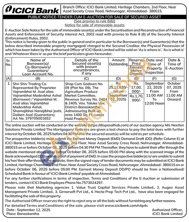 Shop Cum Godown No. 09 (Plot No. 09), The Agriculture Produce Market Committee. Revenue Survey No. 2404 & 2405, Vav, Taluka Vav. District-Banaskantha. Admeasuring Built up area 1400 Sq. Ft.-Lease Hold Property