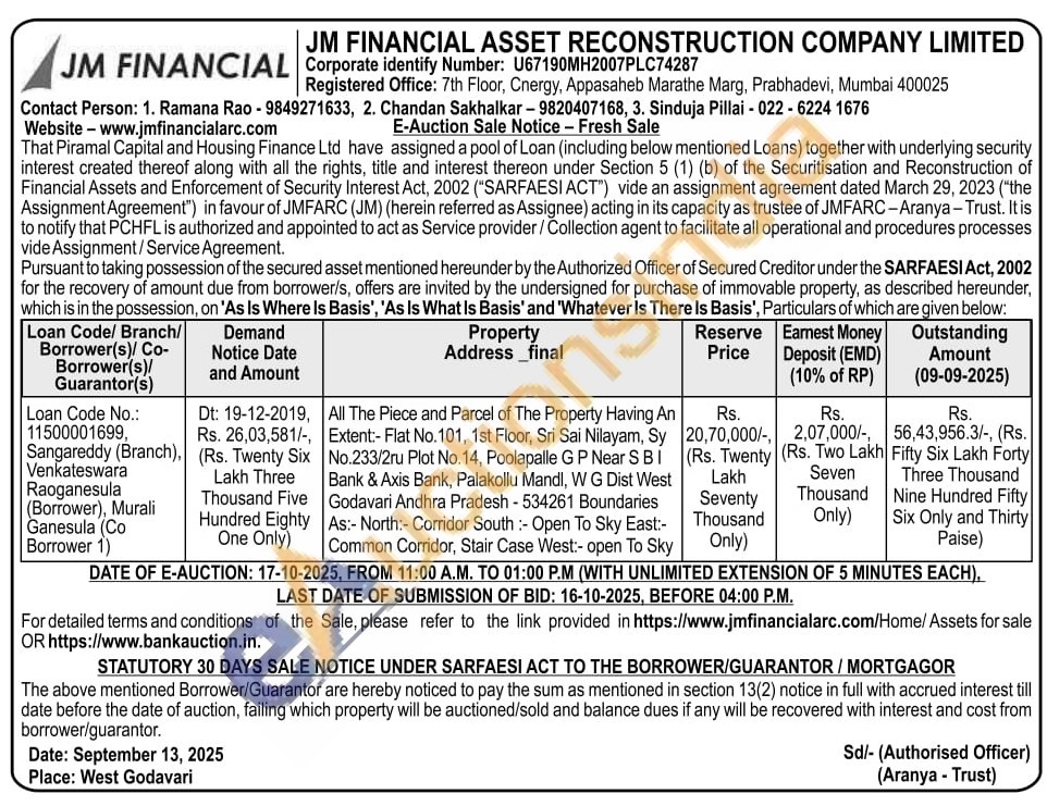 All The Piece and Parcel of The Property Having An Extent:- Flat No.101, 1st Floor, Sri Sai Nilayam, Sy No.233/2ru Plot No. 14, Poolapalle GP Near SBI Bank & Axis Bank, Palakollu Mandl, W G Dist West Godavari Andhra Pradesh - 534261 Boundaries As:- North:- Corridor South :- Open To Sky East:-Common Corridor, Stair Case West:- open To Sky