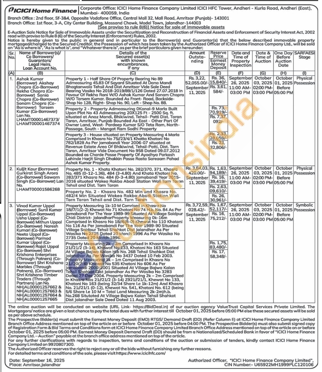 Property 2-Property Admeasuring OKanal-9 Marla Built Upon Plot No 43 Admeasuring 20X125 Ft-2500 Sq. ft. situated at Anaz Mandi, Bhikiwind, Tehsil-Patti Dist. Taran Taran, Amritsar, Punjab Bounded As East Other Part Of Owner Land, West- Pardeep Kumar S/O Teta Ram, North-Passage, South-Mangat Ram Sodhi Property