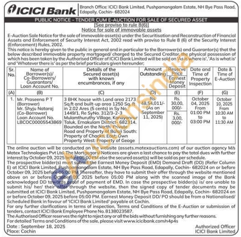 3 BHK house with Land area 2173 Sq.ft and built-up area 1250 Sq. ft in 2.02 Ares (5 cents) in Sy No. 1449/1, Re SyNo. 312/3-2-3 Mulamthuruthy Village, Kanayannur Taluk, Ernakulam District-682314. Bounded on the North: Private Road and Property of Balaji South: Property of Chacko, East: Own Property West: Property of Geoge