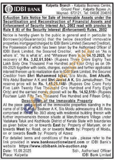 All the piece and parcels of the immovable properties standing in the name of of Shri Abdul Basheer A K, Sio Moidu admeasuring 4.66 Ares comprised in Re Sy No 39/3 along with residential building therein with further improvements thereon situate at Maruthomkara Village under Vadakara Taluk and Kozhikode District of Kerala State with boundaries as given below: on or towards East by: Property of Mariyam, on or towards West by: Road, on or towards North by: Property of Moidu, on or towards South by: Property of Azeez