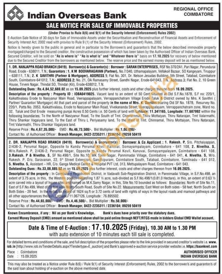 Contact : Branch Manager, 0422-2235311/2236104; 89259 50419