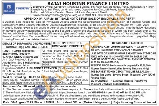 All that piece and parcel of the immovable property bearing bounded on the: Flat No. 1108 A, 11th floor, Anand Prime, Sector-8, HaldighaTI Marg Sanganer, JAIPUR-302033