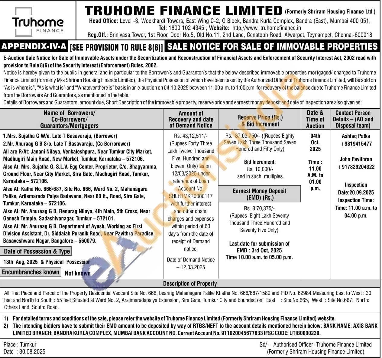 All That Piece and Parcel of the Property Residential Vaccant Site No. 666, bearing Mahanagara Palike Khatha No. 666/687/1580 and PID No. 62984 Measuring East to West: 30 feet and North to South: 55 feet Situated at Ward No. 2, Aralimaradapalya Extension, Sira Gate. Tumkur City and bounded on: East: Site No.665, West: Site No.667, North: Others Land, South: Road.