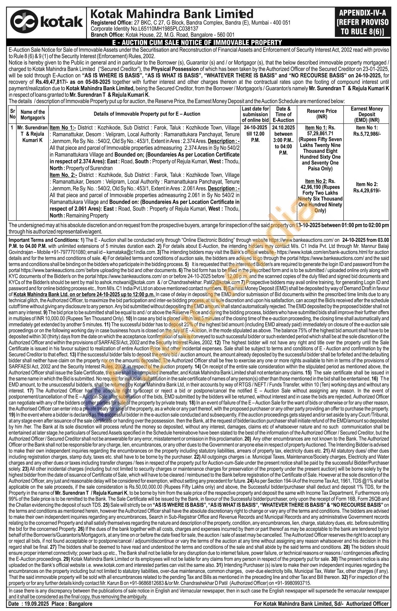 Item No 1:- District: Kozhikode, Sub District: Farok, Taluk: Kozhikode Town, Village : Ramanattukar, Desom: Velipram, Local Authority: Ramanattukara Panchayat, Tenure : Jenmom, Re Sy. No. : 540/2, Old Sy No.: 453/1, Extent in Ares: 2.374 Ares. Description:-All that piece and parcel of Immovable properties admeasuring 2.374 Ares in Sy No 540/2 in Ramanattukara Village and Bounded on; (Boundareies As per Location Certificate in respect of 2.374 Ares): East: Road, South: Property of Rejula Kumari, West: Thodu, North: Property of Surendran