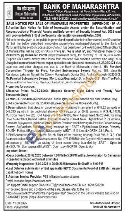 All that plece or parcel of property situated in an extent of 648.52 sq. yards or 542.245 sq mirs in an undivided share of 60.5 sq.yards or 50.58 sq.mtrs in R.S.No.147/8, Municipal Ward No.32E, Old Assessment No.34906, New Assessment No.265447, bearing D.No. 50A-21/4-3, Behind: Lalitha Hospital, Dasari Vari Street, Near: High School, R.R.Gardens, Palamata, vijayawada, Krishna District, Andhra Pradesh which belongs to Pavuluri Subrahmanya Swamy, Slo. Venkata Subbalah being bounded by: EAST: Pydimukkala Saiman Property SOUTH: Pathipati Ramachandra Rao property, WEST: 16% ft. road.NORTH: 33 ft. Road. A Flat/Apartment No.502, on the Fourth Floor of the building bearing D.No.59A-21/4-3, Old Assessment No 620057, New Assessment No. 1073 196868 in the Gayathri Nilayam Apartment, admeasuring 1780 sq.ft consisting of three rooms being bounded by EAST: Open to sky SOUTH: Stair case and lift. WEST: Open to sky NORTH: Open to sky,