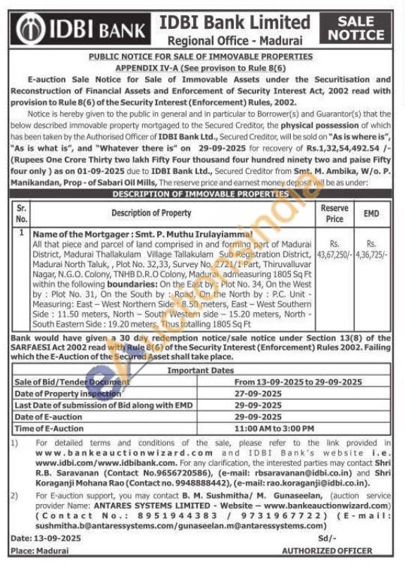 All that piece and parcel of land comprised in and forming part of Madurai District, Madurai Thallakulam Village Tallakulam Sub Registration District, Madurai North Taluk,, Plot No. 32,33, Survey No. 2721/1 Part, Thiruvalluvar Nagar, N.G.O. Colony, TNHB D.R.O Colony, Madurai admeasuring 1805 Sq Ft within the following boundaries: On the East by: Plot No. 34, On the West by: Plot No. 31, On the South by Road, On the North by P.C. Unit -Measuring: East-West Northern Side: 8.50 meters, East-West Southern Side: 11.50 meters, North-South Western side 15.20 meters, North-South Eastern Side: 19.20 meters, Thus totalling 1805 Sq Ft