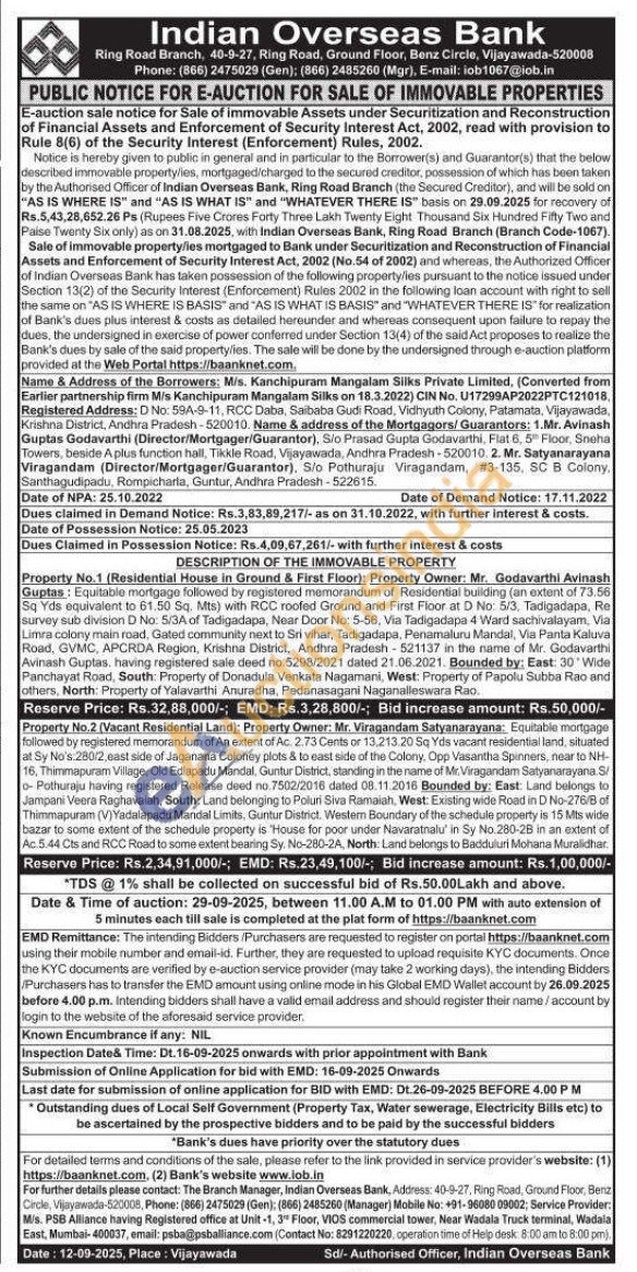 2)Equitable mortgage followed by registered memorandum of An extent of Ac. 2.73 Cents or 13,213.20 Sq Yds vacant residential land, situated at Sy No's 280/2, east side of Jaganana Coloney plots & to east side of the Colony, Opp Vasantha Spinners, near to NH 16. Thimmapuram Village, Old Edlapadu Mandal, Guntur District, standing in the name of Mr.Viragandam Satyanarayana. S o-Pothuraju having registered Release deed no 7502/2016 dated 08.11.2016 Bounded by: East: Land belongs to Jampani Veera Raghavaiah, South: Land belonging to Poluri Siva Ramaiah, West: Existing wide Road in D No-276/8 of Thimmapuram (V)Yadalapadu Mandal Limits, Guntur District. Westem Boundary of the schedule property is 15 Mts wide bazar to some extent of the schedule property is "House for poor under Navaratnalu' in Sy No.280-28 in an extent of Ac.5.44 Cts and RCC Road to some extent bearing Sy. No-280-2A, North: Land belongs to Badduluri Mohana Muralidhar