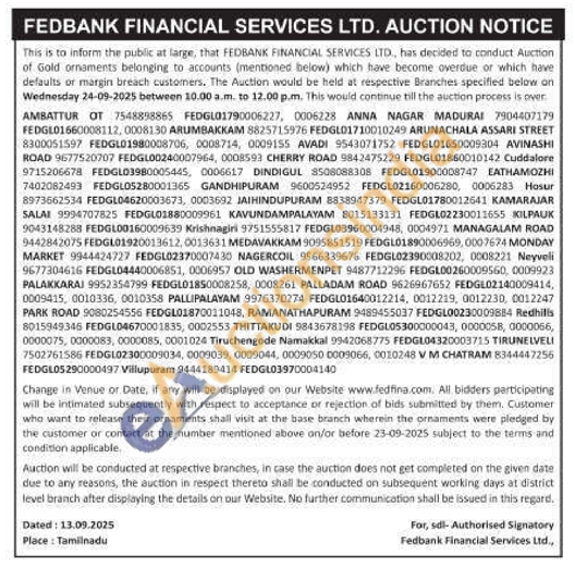 Fedbank Financial Services Ltd Gold Auctions Auction in Madurai