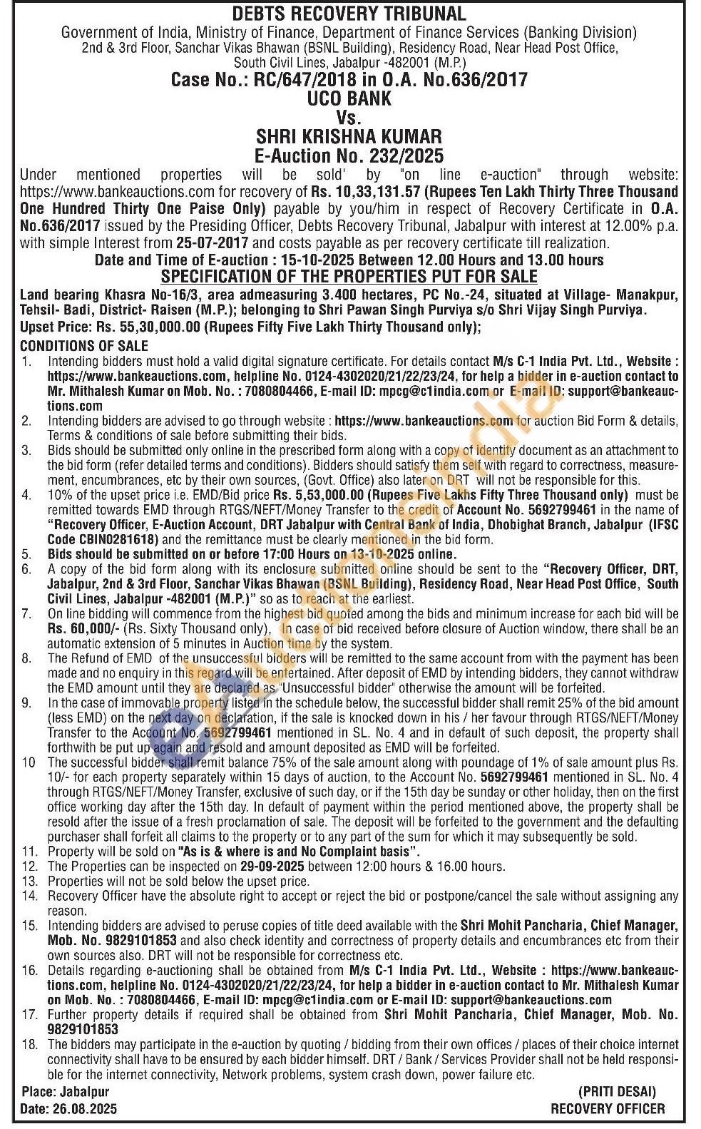 Land bearing Khasra No-16/3, area admeasuring 3.400 hectares, PC No.-24, situated at Village- Manakpur, Tehsil- Badi, District- Raisen (M.P.); belonging to Shri Pawan Singh Purviya s/o Shri Vijay Singh Purviya.