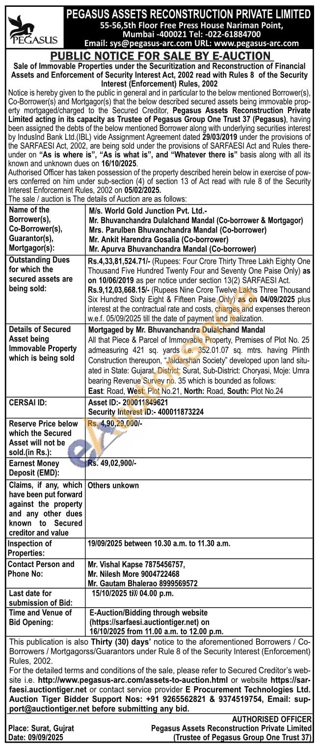 All that Piece & Parcel of Immovable Property, Premises of Plot No. 25 admeasuring 421 sq. yards i.e. 352.01.07 sq. mtrs. having Plinth Construction thereupon, "Jaldarshan Society" developed upon land situ-ated in State: Gujarat, District: Surat, Sub-District: Choryasi, Moje: Umra bearing Revenue Survey no. 35 which is bounded as follows: East: Road, West: Plot No.21, North: Road, South: Plot No.24