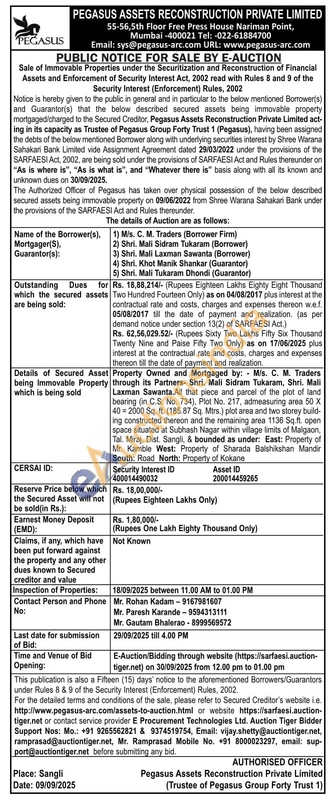 Property Owned and Mortgaged by: M/s. C. M. Traders through its Partners- Shri. Mali Sidram Tukaram, Shri. Mali Laxman Sawanta.All that piece and parcel of the plot of land bearing (in C.S. No. 734), Plot No. 217, admeasuring area 50 X 40-2000 Sq. ft. (185.87 Sq. Mtrs.) plot area and two storey build-ing constructed thereon and the remaining area 1136 Sq.ft. open space situated at Subhash Nagar within village limits of Malgaon, Tal. Miraj, Dist. Sangli, & bounded as under: East: Property of Mr. Kamble West: Property of Sharada Balshikshan Mandir South: Road North: Property of Kokane