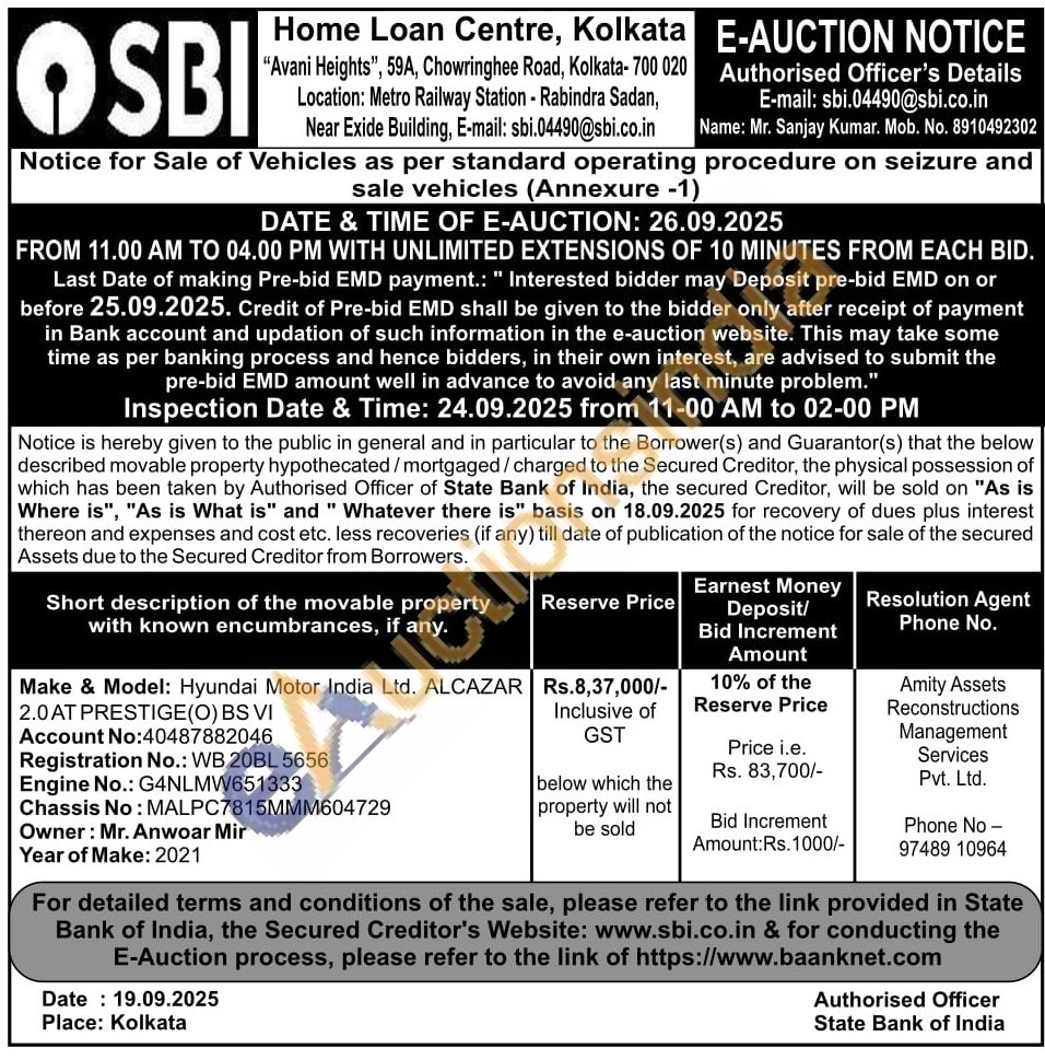 Make & Model: Hyundai Motor India Ltd. ALCAZAR 2.0 AT PRESTIGE(O) BS VI Account No:40487882046 Registration No.: WB 20BL 5656 Engine No.: G4NLMW651333 Chassis No: MALPC7815MMM604729Owner: Mr. Anwoar Mir Year of Make: 2021