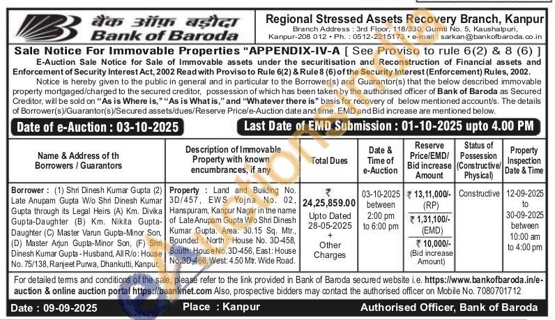 Land and Building No. 3D/457, EWS Yojna No. 02. Hanspuram, Kanpur Nagar in the name of Late Anupam Gupta Wo Shri Dinesh Kumar Gupta. Area: 30.15 Sq. Mtr., Bounded: North House No. 3D-458, South: House No. 3D-456, East: House No. 3D-466, West: 4.50 Mtr. Wide Road