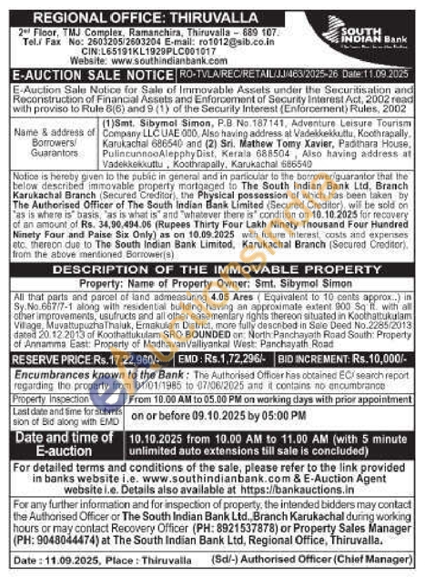 All that parts and parcel of land admeasuring 4.05 Ares (Equivalent to 10 cents approx..) in Sy. No.667/7-1 along with residential building having an approximate extent 900 So it with all ather improvements, usufructs and all other easementary rights thereon situated in Koothattukulam Village, Muvattupuzha Thaluk, Emakulam District, more fully described in Sale Deed No.2285(2013) dated 20.12.2013 of Koothattukulam SRO BOUNDED on North Panchayath Road South: Property of Annamma East: Property of Madhavan Valliyankal West: Panchayath Road