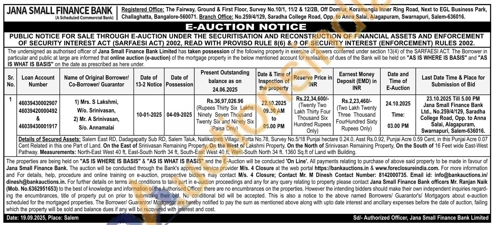 Details of Secured Assets: Salem East RD, Dadagapatty Sub RD, Salem Taluk, Nallikalpatti Village, Patta No.78, Survey No.5/18 Punjai hectare 0.24.0, Asst Rs.0.92, Punjai Acre 0.59 Cent, in this Punjai Acre 0.07 Cent Related in this one Part of Land. On the East of Srinivasan Remaining Property, On the West of Lakshmi Property, On the North of Srinivasan Remaining Property, On the South of 16 Feet wide East-West Pathway. Measurements: North-East West 40 ft. East-South North 34 ft, South-East West 40 ft, West-South North 34 ft. 1360 Sq.ft of Land with Building.