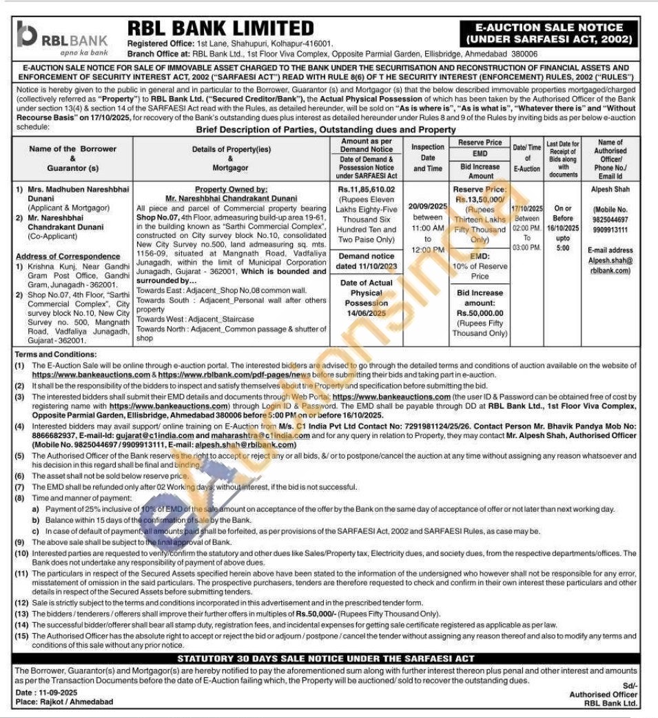 All piece and parcel of Commercial property bearing Shop No.07, 4th Floor, admeasuring build-up area 19-61, in the building known as "Sarthi Commercial Complex". constructed on City survey block No.10, consolidated New City Survey no.500, land admeasuring sq. mts. 1156-09, situated at Mangnath Road, Vadfaliya Junagadh, within the limit of Municipal Corporation Junagadh, Gujarat-362001, Which is bounded and surrounded by... Towards East: Adjacent Shop No.08 common wall. Towards South Adjacent Personal wall after others property Towards West: Adjacent Staircase Towards North: Adjacent Common passage & shutter of shop