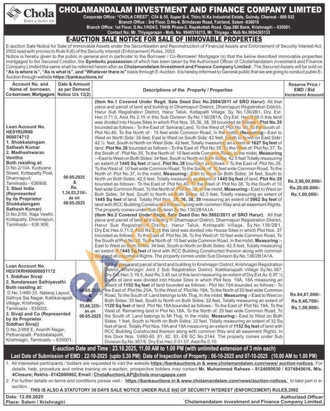 (Item No.1 Covered Under Regd. Sale Deed Doc No.2084/2011 of SRO Harur). All that piece and parcel of land and building in Dharmapuri District, Dharmapuri Registration District, Harur Sub Registration District, Harur Taluk, Kottapatti Village, Sy. No. 136/281, Dry. Ext. Hec. 0.71.0, Asst Rs.2.15 in this Sub Division Sy. No. 136/281A, Dry. Ext. Hec 0.66.0 this land was divided into House Sites in which Plot Nos. 35,36, 38, 39 bounded as follows:- Plot No.35 bounded as follows-To the East of Selvaraj Land, To the West of Plot No. 36, To the South of Plot No. 40, To the North of 10 feet wide Common Road, In the midst, Measuring:- East to West on North Side: 35 feet, East to West on South Side: 42 feet, South to North on East Side 42% feet, South to North on West Side: 42 feet, Totally measuring an extent of 1627 Sq feet of land. Plot No.36 bounded as follows:- To the East of: Plot No.35, To the West of: Plot No.37. To the South of: Plot No.39, To the North of: 10 feet wide Common Road, in the midst, Measuring -East to West on Both Sides: 34 feet, South to North on Both Sides: 42.5 feet Totally measuring an extent of 1445 Sq feet of land. Plot No.38 bounded as follows: To the East of. Plot No.39. To the West of: 10 feet wide Common Road, To the South of 10 feet wide Common Road, To the North of: Plot No.37, In the midst, Measuring:-East to West on Both Sides: 34 feet, South to North on Both Sides: 42.5 feet, Totally measuring an extent of 1445 Sq feet of land. Plot No.39 bounded as follows: To the East of Plot No 40, No.40, To the West of: Plot No 38, Not No.38, To the South of 10 feet wide Common Road, To the North of: Plot No.36, In the midst, Measuring:-East to West on Both Sides: 34 feet. South to North on Both Sides: 42.5 feet, Totally measuring an extent of 1445 Sq feet of land. Totally Piot Nos. 35, 36, 38, 39 measuring an extent of 5962 Sq feet of land with RCC Building Constructed thereon along with common Way and all easement Rights, The property comes under Sub Division Sy. No. 136/281A1A,(Item No.2 Covered Under Regd. Sale Deed Doc No.5802/2011 of SRO Harur). All that piece and parcel of land and building In Dharmapuri District, Dharmapuri Registration District, Harur Sub Registration District, Harur Taluk, Kottapatti Village, Sy. No. 136/281, Dry Ext. Hec. 0.71.0, Asst Rs.2.15 this land was divided into House Sites in which Plot Nos. 37 bounded as follows - To the East of. Plot No.36, To the West of: 10 feet wide Common Road, To the South of Plot No.38. To the North of: 10 feet wide Common Road, In the midst, Measuring:-East to West on Both Sides: 34 feet, South to North on Both Sides: 42.5 feet, Totally measuring an extent of 1445 Sq feet of land with RCC Building Constructed thereon along with common Way and all easement Rights. The property comes under Sub Division Sy. No. 136/281A1A