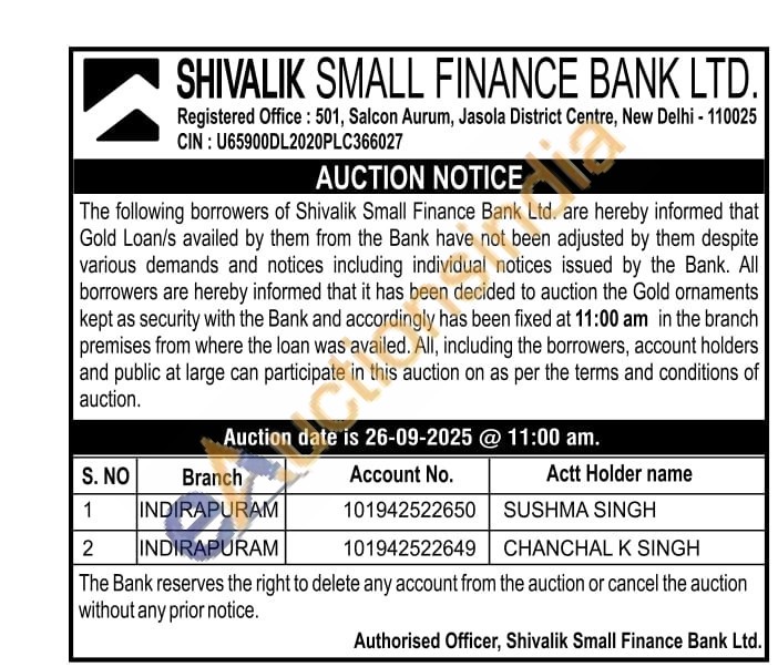 Shivalik Small Finance Bank Ltd Gold Auctions Auction in New Delhi