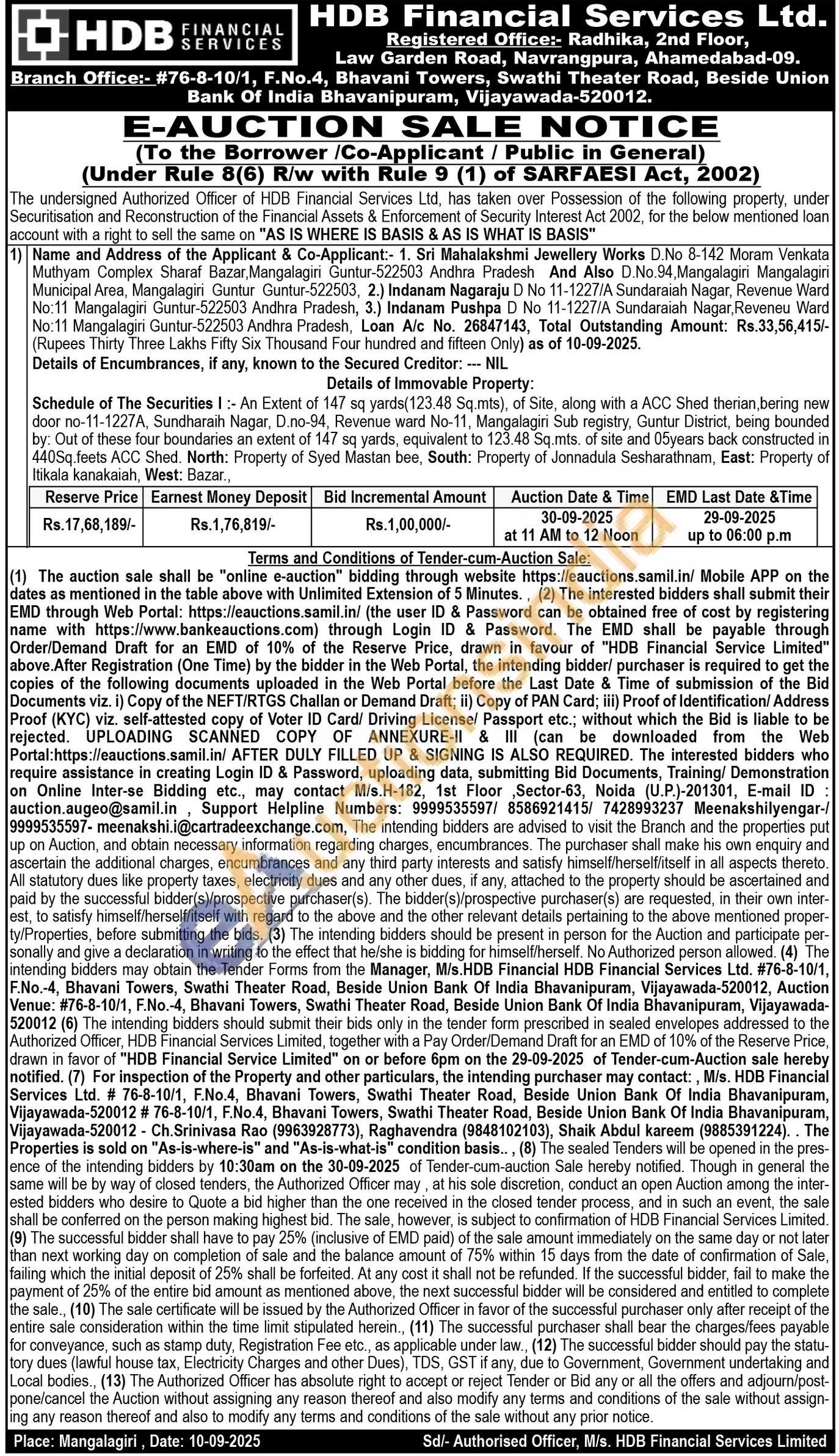 Schedule of The Securities I:- An Extent of 147 sq yards (123.48 Sq.mts), of Site, along with a ACC Shed therian, bering new door no-11-1227A, Sundharaih Nagar, D.no-94, Revenue ward No-11, Mangalagiri Sub registry, Guntur District, being bounded by: Out of these four boundaries an extent of 147 sq yards, equivalent to 123.48 Sq.mts. of site and 05years back constructed in 440Sq feets ACC Shed. North: Property of Syed Mastan bee, South: Property of Jonnadula Sesharathnam, East: Property of Itikala kanakaiah, West: Bazar,