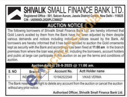 Shivalik Small Finance Bank Ltd Gold Auctions Auction in New Delhi