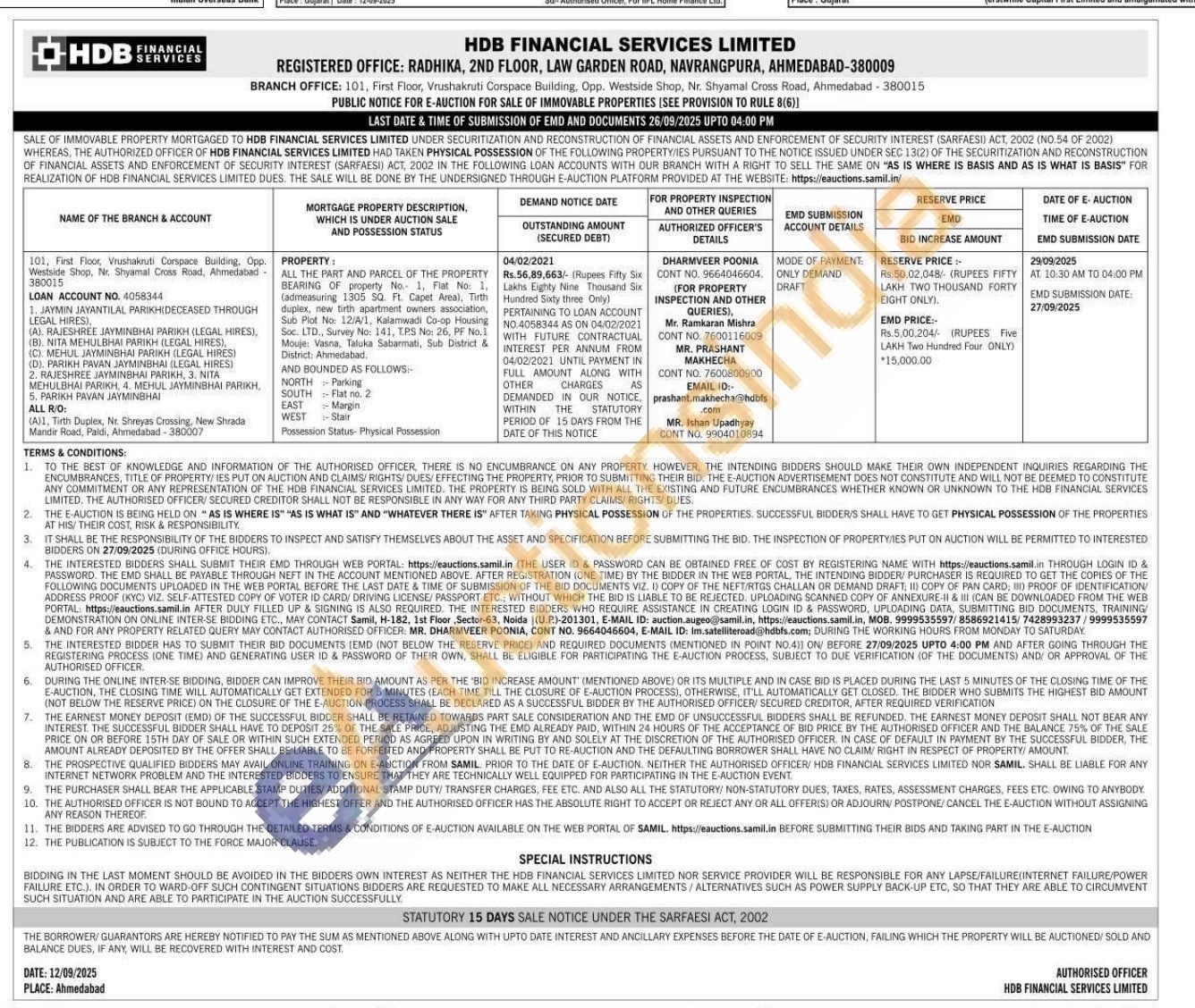 ALL THE PART AND PARCEL OF THE PROPERTY BEARING OF property No. 1, Flat No. 1. Cadmeasuring 1305 SQ. Ft. Capet Areal, Tirth duplex, new tirth apartment owners association, Sub Plot No: 12/A/1, Kalamwadi Co-op Housing Soc. LTD., Survey No: 141, TPS No: 26, PF No.1 Mouje: Vasna, Taluka Sabarmati, Sub District & District: Ahmedabad. AND BOUNDED AS FOLLOWS NORTH Parking SOUTH Flat no. 2 EAST Margin WEST Stair Possession Status- Physical