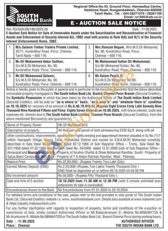 All that part and parcel of land admeasuring 5330 Sq.ft. along with all other constructions, improvements, easementary rights existing and appurtenant thereon situated in Sy No.71/7 within Veerapatti Village, Illupur Taluk, Pudukottai District and owned by S.N.K.M.Oli Mohamed morefully described in Sale Deed No.5676/1956 dated 02.12.1956 of Sub Registrar Office Trichy, Sale Deed No. 331/1958 dated 27.03.1958 and Partition Deed No. 34/2000 dated 12.01.2000 both of Sub Registrar Office Annavasal and Bounded on: North: Property of Ibrahim Shahib & Shiek Mohamed Rawthar, South: Property of Saliya Beevi Compound Wall, East: Property of TK Abdul Rahman Rawthar, West: Pathway