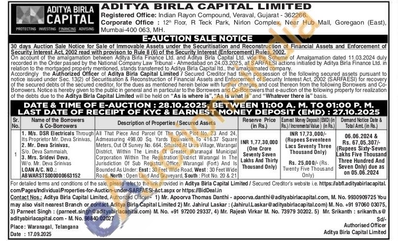 All That Piece And Parcel Of The Open Plot No. 23 And 24, Admeasuring 498.00 Sq. Yards Equivalent To 416.37 Square Meters, Out Of Survey No. 664, Situated At Urus Village, Warangal District, Within The Limits Of Greater Waranagal Municipal Corporation Within The Registration District Warangal In The Jurisdiction Of Sub Registrar Office, Warangal (Fort) And Is Bounded As Under: East: 30 Feet Wide Road, West: 30 Feet Wide Road, North: Open Land And Graveyard, South: Plot No. 20 & 21