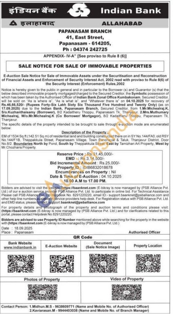 EM of 1534 Sq ft (142.51 Sq.m) of residential land and building constructed there on in SY No. 144/FAD, old RSY No. 144/F1B, Theppakkula Street, Papanasam Village, Town Panchayat & Taluk, Thanjavur District, Door No.8/2. Boundaries North by Pond, South by Theppakkula Street, East by Tamizhan Art Property, West by Mr. Chozhans Property:
