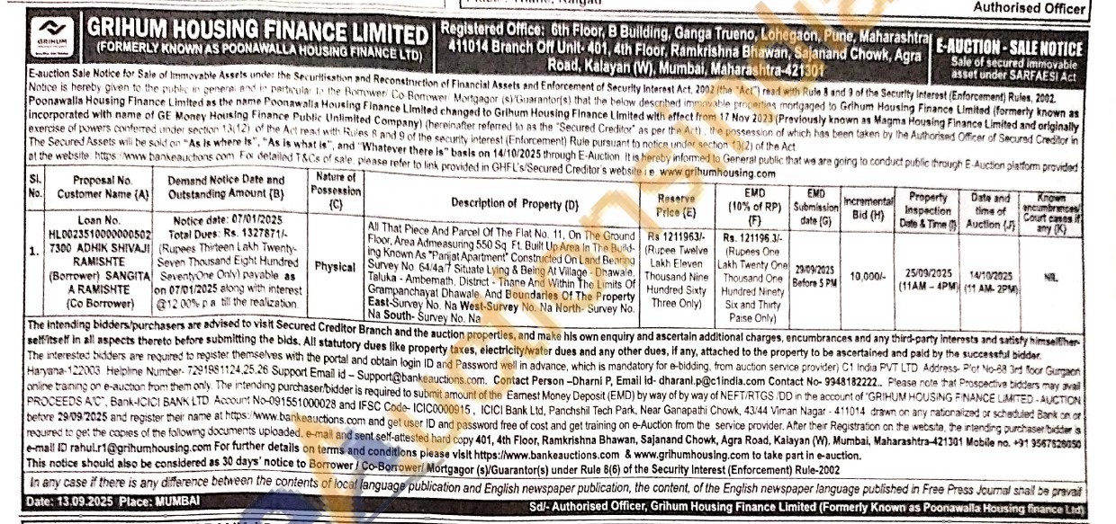 All That Piece And Parcel Of The Flat No. 11, On The Ground Floor, Area Admeasuring 550 Sq. Ft. Built Up Area In The Build ing Known As "Parijat Apartment Constructed On Land Bearing Survey No 64/4a7 Situate Lying & Being At Village-Dhawale Taluka Ambemath, District - Thane And Within The Limits Of Grampanchayat Dhawale. And Boundaries Of The Property East-Survey No. Na West-Survey No. Na North- Survey No. Na South- Survey No. Na