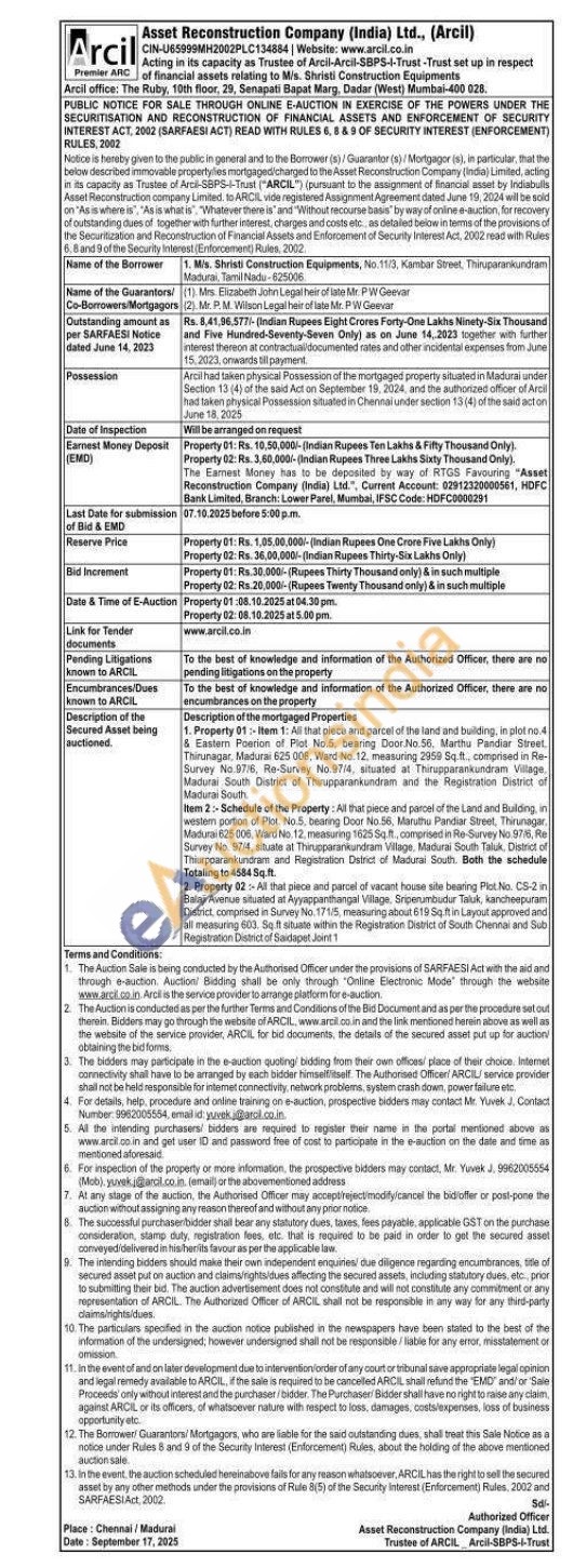 item 2 Schedule of the Property: All that piece and ponor of the Land and Buiding westom portion of Platex, bearing Door fio. Mathe Pandiar Street Thirunagar Madurai 625006 Ward No. 12, measuring 1628sq ft comprised Survey No 19/4, situate at The Thirupprankundram Village, Madurai South Taluk Dist of Thirupprankundram and Registration Dist of Madurai Souft. Both the schedule Totaling to 4584 Sqft