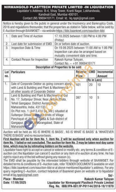 Sale of Corporate Debtor as going concern along with Land & Building and Plant & Machinery & all other assets of Corporate Debtor