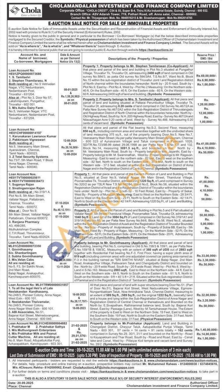 Property 2: All that piece and Parcel of Land and Building in Plot No.5 and 6 Part situated at Vallalar Nagar, 5th Street, Thandurai Village, Poonamallee Taluk, Tiruvallur Dt, admeasuring 1040 Sq.ft of Land out of the 3084 Sq.Ft of Land Comprised in Old Survey No. 319/1A1 and 319/1A Patta No.85, as per Patta New Survey No.84/6, Block No.58, Ward No.E. situated within the Sub Registration District of Avadi and the Registration District of Tiruvallur Bounded on the North by-Property of Arulprakasam, South by-Property of Sobia BB, East by-5th Main Road, West By Property of Rajan, Measuring On the Northern Side-52 Ft. On the Southem Side-52 Ft. On the Eastem Side-20 Ft, On the Western Side-20 Ft. Admeasuring 1040 Sq.Ft of Land and Building. (Symbolic Possession)