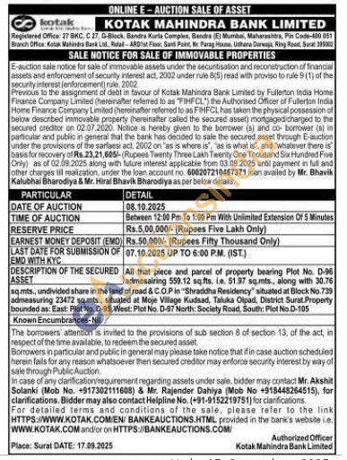 All that piece and parcel of property bearing Plot No. D-96 admesairing 559.12 sq.fts, ie. 51.97 sq.mts., along with 30.76 sq.mts., undivided share in the land of road & C.O.P in "Shraddha Residency situated at Block No. 739 admeasuring 23472 sq.mts, situated at Moje Village Kudsad, Taluka Olpad District Surat Property bounded as: East: Plot No. D-95, West: Plot No. D-97 North: Society Road, South: Plot No.D-105