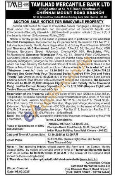 Land to the extent of 510 sq.ft (UDS) in S.No. 185. pt. 166 part and residential flat constructed (unapproved) thereat to the extent of 747 sq ft at Second Floor, Lakshmi Apartments, Door No. 1117E, Plot No. 1117, Ward No.89. West End colony, TS. Krishna Nagar Bus stop, Mugappair Village, Anna Nagar West Extension, Saidapet Taluk, Chennai-600 050 standing in the name of Mrs. Subha W/o Mr.C.Ramanand Boundaries North by: Plot No. 1118, South by Plot No. 1116. Eastby: Plot No. 1123 & 1124, West by: 30 feet Road.