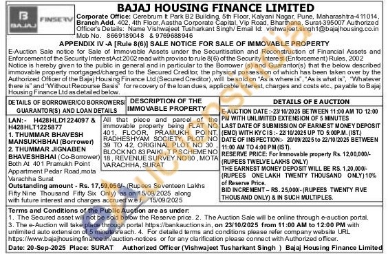 All that piece and parcel of the immovable property being FLAT NO 401, FLOOR, DOR, PRAMUKH POINT, RADHESHYAM SOCIETY, PLOT NO 39 TO 42, ORIGINAL PLOT NO 30 BLOCK NO 83 PAIKI, TP SCHEMENO 18, REVENUE SURVEY NO 80, MΟΤΑ VARACHHA, SURAT