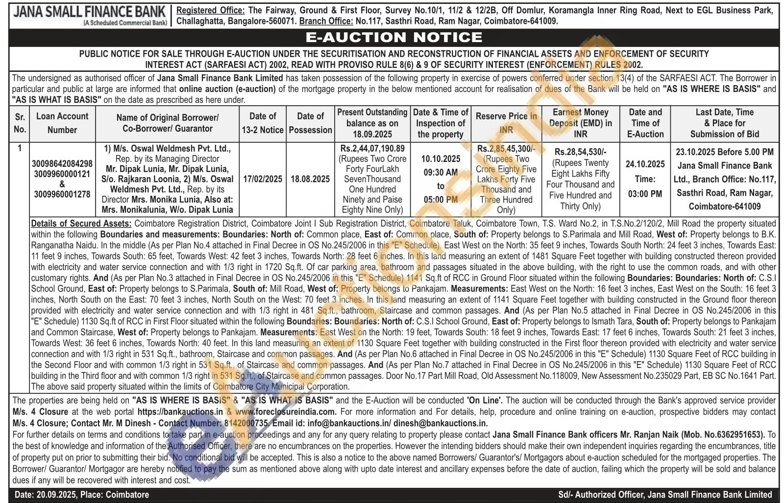 Details of Secured Assets: Coimbatore Registration District, Coimbatore Joint | Sub Registration District, Coimbatore Taluk, Coimbatore Town, T.S. Ward No.2, in T.S.No.2/120/2, Mill Road the property situated within the following Boundaries and measurements: Boundaries: North of: Common place, East of: Common place, South of: Property belongs to S.Parimala and Mill Road, West of: Property belongs to B.K. Ranganatha Naidu. In the middle (As per Plan No.4 attached in Final Decree in OS No.245/2006 in this "E" Schedule). East West on the North: 35 feet 9 inches, Towards South North: 24 feet 3 inches, Towards East: 11 feet 9 inches, Towards South: 65 feet, Towards West: 42 feet 3 inches, Towards North: 28 feet 6 inches. In this land measuring an extent of 1481 Square Feet together with building constructed thereon provided with electricity and water service connection and with 1/3 right in 1720 Sq.ft. Of car parking area, bathroom and passages situated in the above building, with the right to use the common roads, and with other customary rights. And (As per Plan No.3 attached in Final Decree in OS No.245/2006 in this "E" Schedule) 1141 Sq.ft of RCC in Ground Floor situated within the following Boundaries: Boundaries: North of: C.S.I School Ground, East of: Property belongs to S.Parimala, South of: Mill Road, West of: Property belongs to Pankajam. Measurements: East West on the North: 16 feet 3 inches, East West on the South: 16 feet 3 inches, North South on the East: 70 feet 3 inches, North South on the West: 70 feet 3 inches. In this land measuring an extent of 1141 Square Feet together with building constructed in the Ground floor thereon provided with electricity and water service connection and with 1/3 right in 481 Sq.ft., bathroom, Staircase and common passages. And (As per Plan No.5 attached in Final Decree in OS No.245/2006 in this "E" Schedule) 1130 Sq.ft of RCC in First Floor situated within the following Boundaries: Boundaries: North of: C.S.I School Ground, East of: Property belongs to Ismath Tara, South of: Property belongs to Pankajam and Common Staircase, West of: Property belongs to Pankajam. Measurements: East West on the North: 19 feet, Towards South; 18 feet 9 inches, Towards East: 17 feet 6 inches, Towards South: 21 feet 3 inches, Towards West: 36 feet 6 inches, Towards North; 40 feet. In this land measuring an extent of 1130 Square Feet together with building constructed in the First floor thereon provided with electricity and water service connection and with 1/3 right in 531 Sq.ft., bathroom, Staircase and common passages. And (As per Plan No.6 attached in Final Decree in OS No.245/2006 in this "E" Schedule) 1130 Square Feet of RCC building in the Second Floor and with common 1/3 right in 531 Sq.ft., of Staircase and common passages. And (As per Plan No.7 attached in Final Decree in OS No.245/2006 in this "E" Schedule) 1130 Square Feet of RCC building in the Third floor and with common 1/3 right in 531 Sq.ft., of Staircase and common passages. Door No.17 Part Mill Road, Old Assessment No. 118009, New Assessment No.235029 Part, EB SC No.1641 Part. The above said property situated within the limits of Coimbatore City Municipal Corporation.