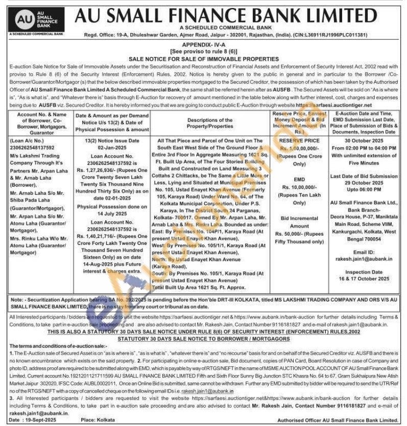 All That Piece and Parcel of One Unit on The South East West Side of The Ground Floor & Entire 3rd Floor In Aggregate Measuring 1621 Sq. Ft. Built Up Area, of The Four Storied Building Built and Constructed on Land Measuring 3 Cottahs 2 Chittacks, be The Same a Little More or Less, Lying and Situated at Municipal Premises No. 105, Ustad Enayet Khan Avenue (Formerly 105, Karaya Road) Under Ward No. 64, of The Kolkata Municipal Corporation, Under P.S.Karaya, In The District South 24 Parganas, Kolkata-700017. Owned By Mr. Arpan Laha, Mr. Arnab Laha & Mrs. Rinku Laha. Bounded as under: East: By Premises No. 104P/1, Karaya Road (At present Ustad Enayet Khan Avenue).West: By Premises No. 105/1/1, Karaya Road (At present Ustad Enayet Khan Avenue). North: By Ustad Enayet Khan Avenue (Karaya Road),South: By Premises No. 105/1, Karaya Road (At present Ustad Enayet Khan Avenue) Total Built Up Area 1621 Sq. Ft. Approx.