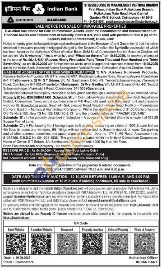 Property ID No. IDIB6888841451 Schedule 'A': In Coimbatore Registration District, Joint-1 Sub Registration District, Coimbatore Town, on the southern side of Mill Road, old ward no 2, then ward no 8 and presently ward no 15. Bounded as under, South of Sukrawarpet Road, West of - Hozur Road, North of-Presentation Convent, East of Municipal High School Compound. Within the above an extent of 31.00 Cents of land in Old TS No 2/103, New TS No 128,129,130 & 131 and the property called as FRAZER SQUARE" Schedule 'B': In the property described in Schedule - A above an Undivided Share to an extent of 351.29 Square Feet of Land. Schedule 'C': A Flat bearing No 3 having super built up area measuring an extent of 1005 Square feet on 4th floor, its doors and windows, EB fittings with connection and its Security deposit amount, Car parking and all other common amenities and appurtenances thereto. Door no: 17/15, Mill Road, Assessment no: 81235456, E.B.S.C No 001-001-1536. The property is situated within the limits of Coimbatore Corporation. Name of Owner: ST Sriram, S/o Santhanam. Measurement: 1005 Sq ft on 4th Floor.