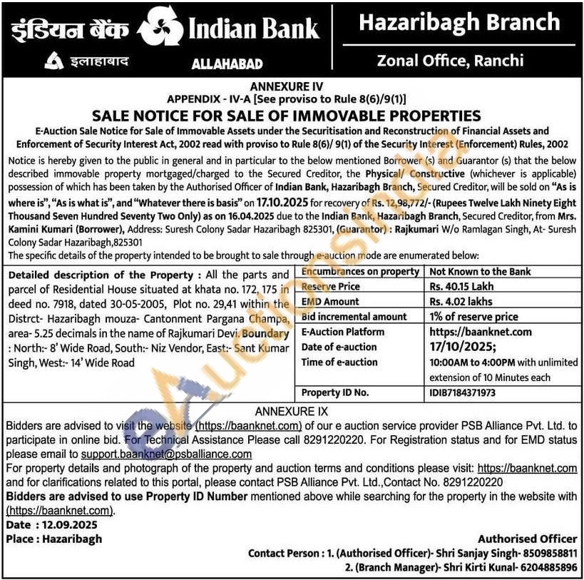 Detailed description of the Property: All the parts and parcel of Residential House situated at khata no. 172, 175 in deed no. 7918, dated 30-05-2005, Plot no. 29,41 within the Distrct- Hazaribagh mouza- Cantonment Pargana Champa, area-5.25 decimals in the name of Rajkumari Devi. Boundary : North:- 8' Wide Road, South:- Niz Vendor, East:- Sant Kumar Singh, West:- 14' Wide Road