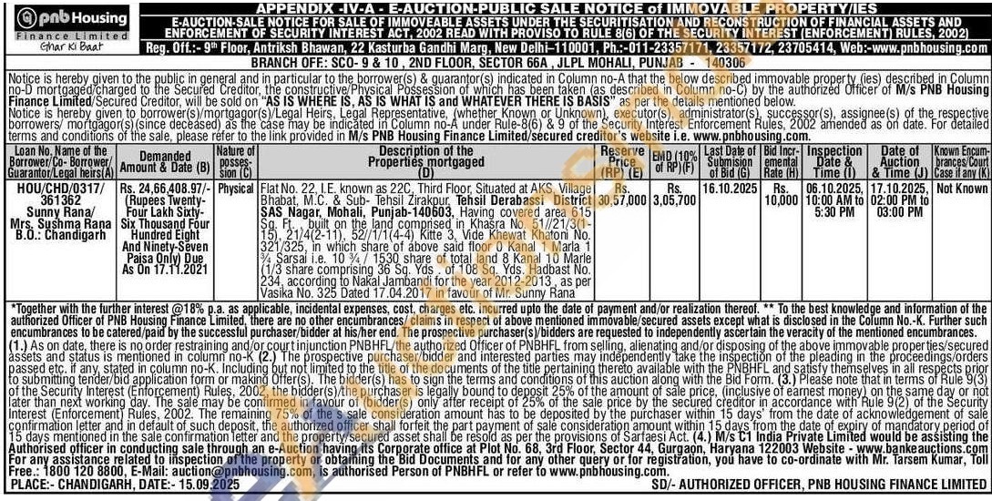 Flat No. 22. I.E. known as 220, Third Floor, Situated at AKS Village Bhabat, M.C. & Sub- Tehsil Zirakpur, Tehsil Derabassi SAS Nagar, Mohali, Punjab-140603, Having covered area 615 built on the land comprised hashewat khaton No. 321/325, in which share of above said floor 0 Kanal 1 Marla 1 Sarsal i.e. 10/1530 share of total land 8 Kanal 10 Marle (1/3 share comprising 36 Sq. Yds of 108 Sq. Yds. Hadbast No. 234, according to Nakal Jambandi for the year 2012-2013, as per Vasika No. 325 Dated 17.04.2017 in favour of Mr. Sunny Rana
