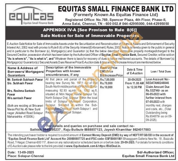 All that piece and parcel of the property bearing new Survey No. 167/1 out of that South-North middle partion of Plot No. 58 Ad-measuring 92.93 sqmtr. i.e. 1000 sq.ft. situated at Nitin Nagar, Kasbe Solapur Tal. North Solapur Dist. Solapur Within the local limits of Solapur Municipal Corporation, Solapur. Situaled at within the Sub-Registration District of North Solapur I and Registration District of Solapur.
