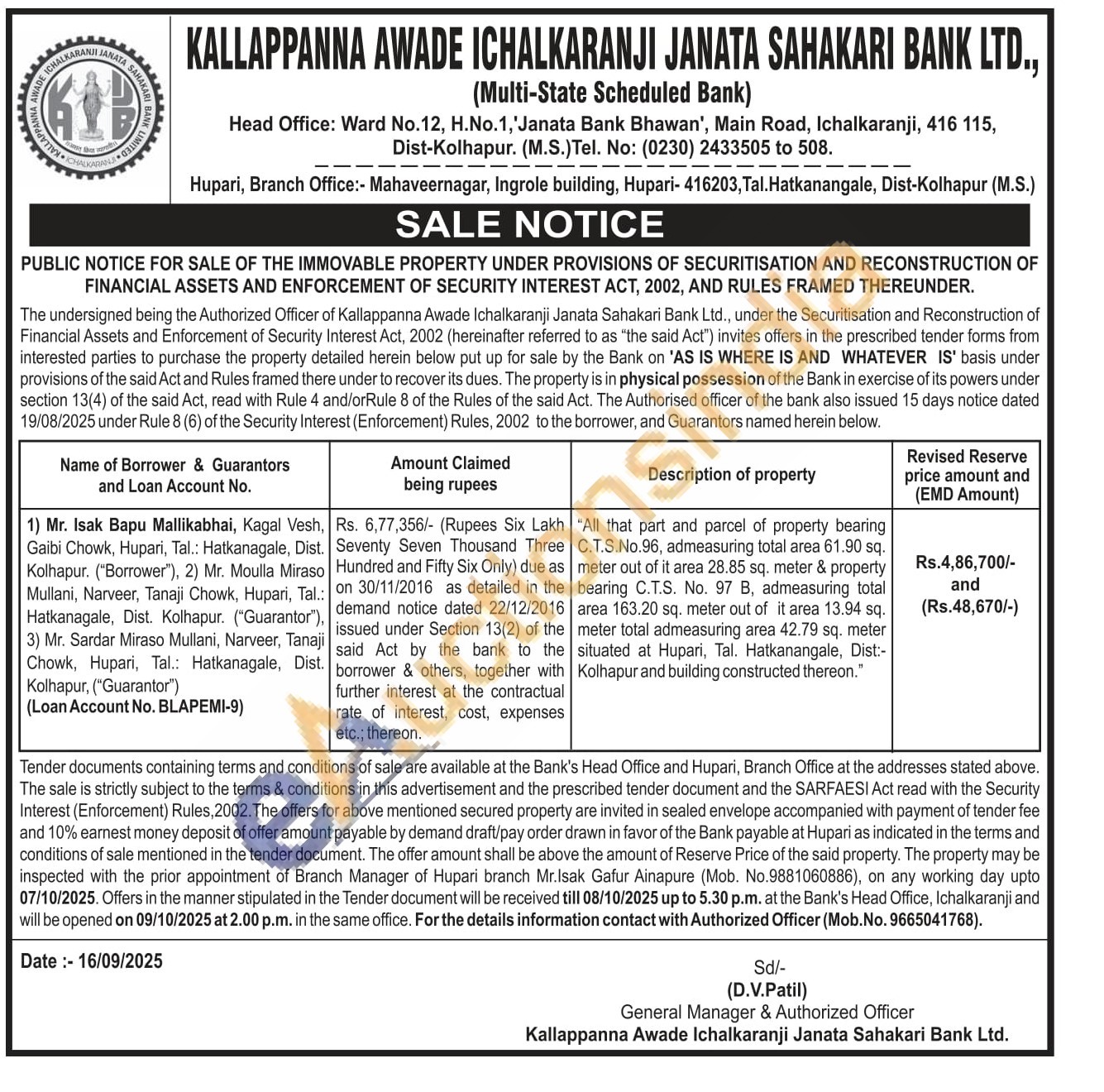 "All that part and parcel of property bearing C.T.S.No.96, admeasuring total area 61.90 sq. meter out of it area 28.85 sq. meter & property bearing C.T.S. No. 97 B, admeasuring total area 163.20 sq. meter out of it area 13.94 sq. meter total admeasuring area 42.79 sq. meter situated at Hupari, Tal. Hatkanangale, Dist:-Kolhapur and building constructed thereon."