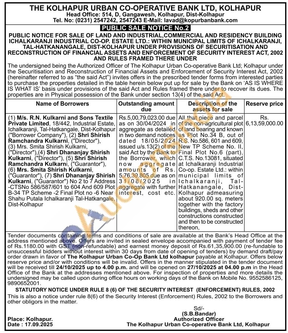 All that piece and parcel of the non-agricultural plot of land bearing and known as Plot No.34 B, out of R.S. No.586, 601 and 609, New TP Scheme No. II, Final Plot No.6 (part), C.T.S. No.13081, situated at Ichalkaranji Industrial Co-op. Estate Ltd.: within municipal municipal limits of Ichalkaranji, Ichalkara Hatkanangale, Dist-Kolhapur admeasuring about 920.00 sq. meters together with the factory buildings, sheds and other constructions constructed and then to be constructed thereon