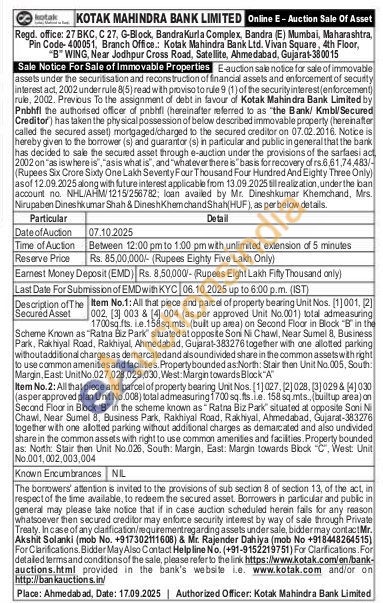 Item No.1: All that piece and parcel of property bearing Unit Nos. [1]001, [2] 002, [3] 003 & [4] 004 (as per approved Unit No.001) total admeasuring 1700sq.fts. i.e.158sq.mts. (built up area) on Second Floor in Block "B" in the Scheme Known as "Ratna Biz Park" situated at opposite Soni Ni Chawl, Near Sumel 8, Business Park, Rakhiyal Road, Rakhiyal, Ahmedabad, Gujarat-383276 together with one allotted parking withoutadditional chargesas demarcatedand alsoundivided share in the common assets with right to use common amenitesand facilities. Property bounded as North. Stair then Unit No.005, South: Margin, East: UnitNo.027,028,029,030, West: Margin towards Block"A"