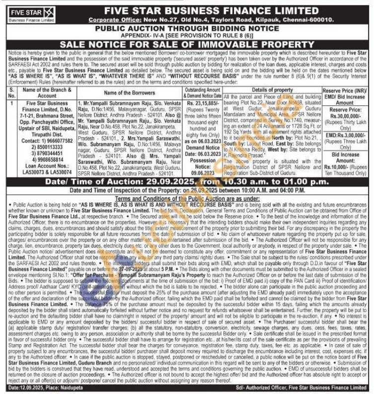 All the parcel and Piece of Land and building bearing Plot No.22, Near Door No458, situated at West Gudur, Jenakirampeta, Guduru Mandalam and Municipal Area, SPSR Nellore District, comprised in Survey No. 1740, measur ing an extent of 24 Ankanams or 1728 Sq. Ft or 192 Sq Yards with all easement rights attached to t it being bounded in North by: Plot No 21. South by: Layout Road, East by: Site belongs to N. Krishna Reddy, West by: Site belongs to