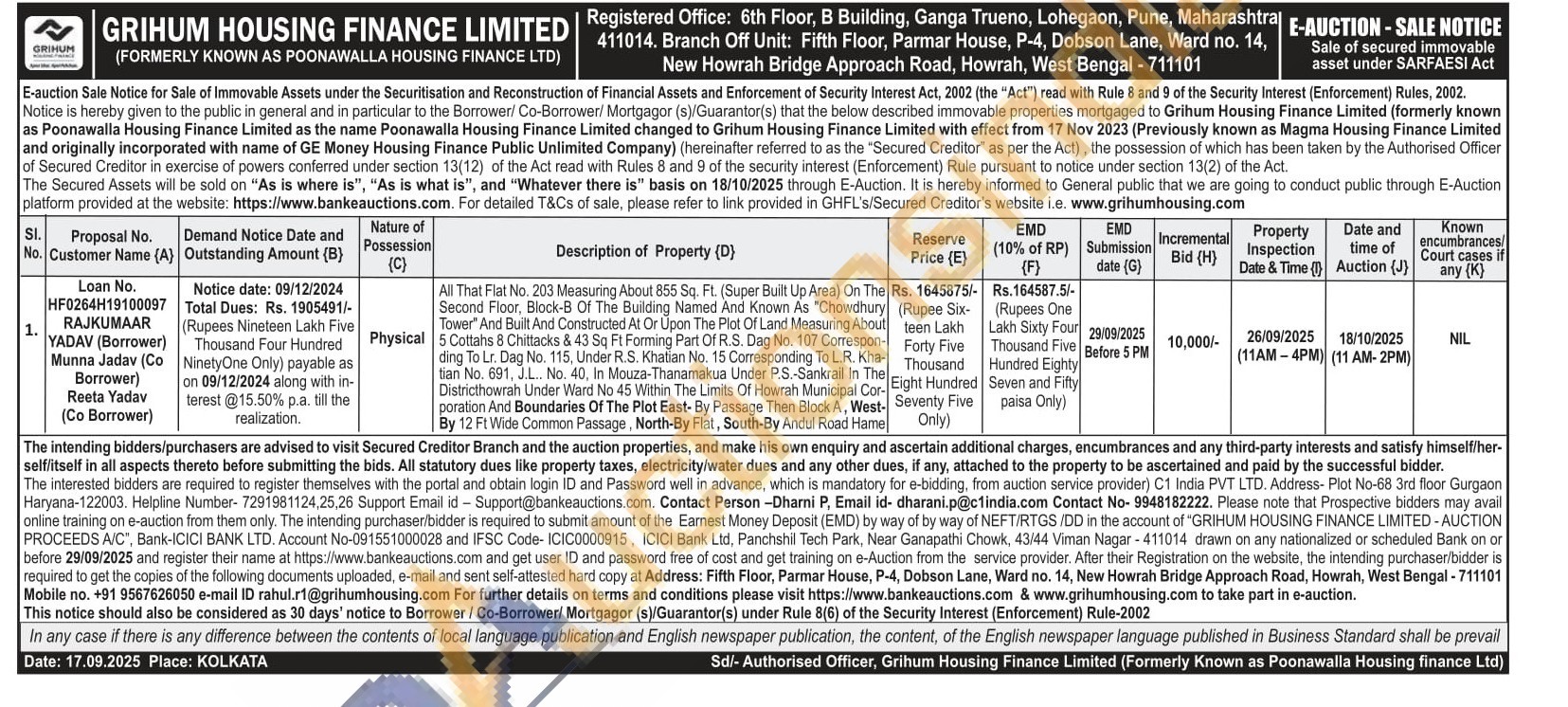 All That Flat No. 203 Measuring About 855 Sq. Ft. (Super Built Up Area) On The Second Floor, Block-B Of The Building Narned And Known As "Chowdhury Tower" And Built And Constructed At Or Upon The Plot Of Land Measuring About 5 Collahs 8 Chittacks & 43 Sq Ft Forming Part Of R.S. Dag No. 107 Correspon-ding To Lr. Dag No. 115, Under R.S. Khatian No. 15 Corresponding To L.R. Kha tian No. 691, J.L.. No. 40, In Mouza-Thanamakua P.S.-Sankrail In The District howrah Under Ward No 45 Within The Limits Of Howrah Municipal Cor poration And Boundaries Of The Plot East-By Passage Then Block A, West-By 12 Ft Wide Common Passage, North-By Flat, South-By Andul Road Hame